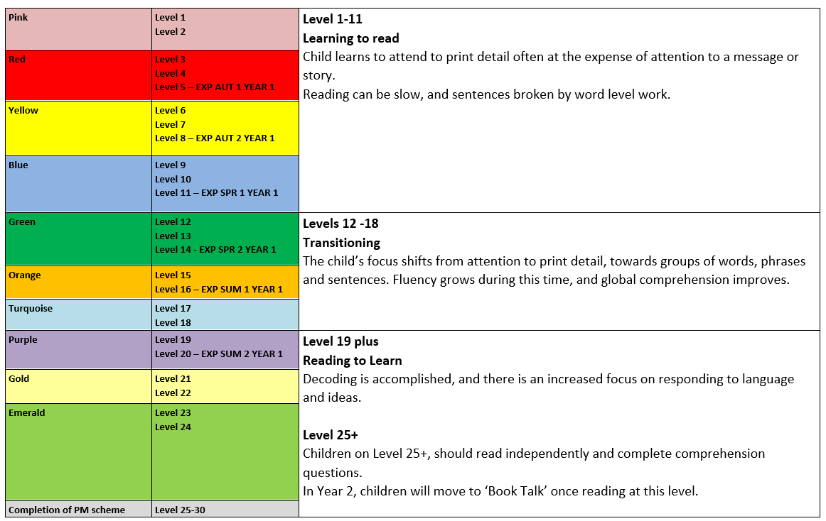 Different from Phonics, this reading judgement is formed from on-going assessments through DSR, a reading programme that involves children reading with an adult in a small group basis until they reach at least level 24. This runs from the end of Reception through to Year 2 (it will continue through an intervention into Year 3 and Year 4 if a child has not yet reached level 24). School reports will indicate what level a child has reached at the end of the academic year. Parents can use the grid below to see where the level equates to in their reading journey.